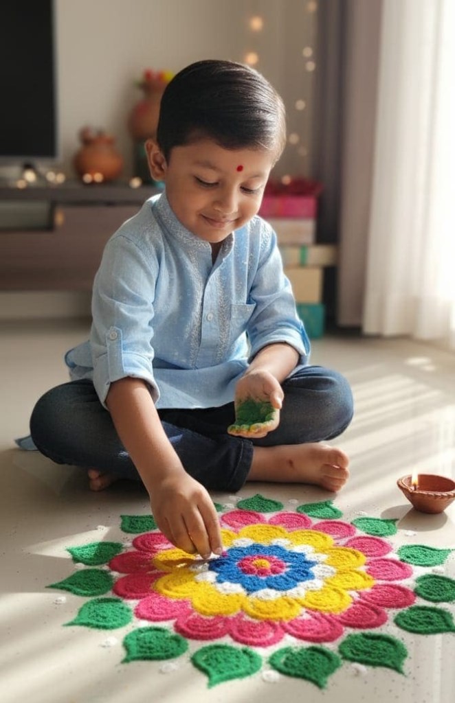 Nihan sitting on floor making rangoli with colorful powders, wearing light blue kurta, natural sunlight through window, diya beside him, face detailed and lifelike, Diwali home vibe |